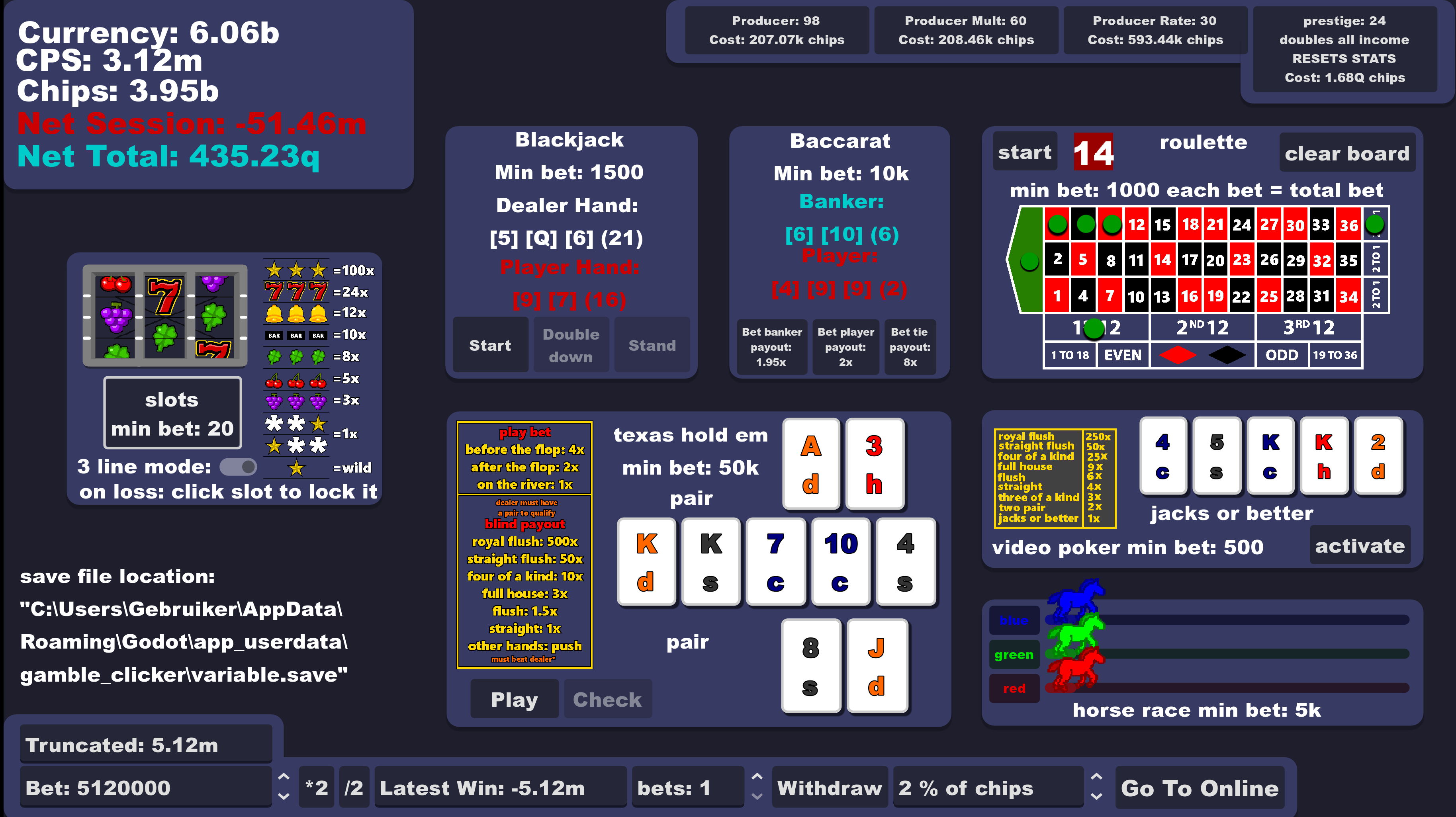run the executable. game autosaves. save file location:"C:\Users\User\AppData\Roaming\Godot\app_userdata\gamble_clicker\variable.save"